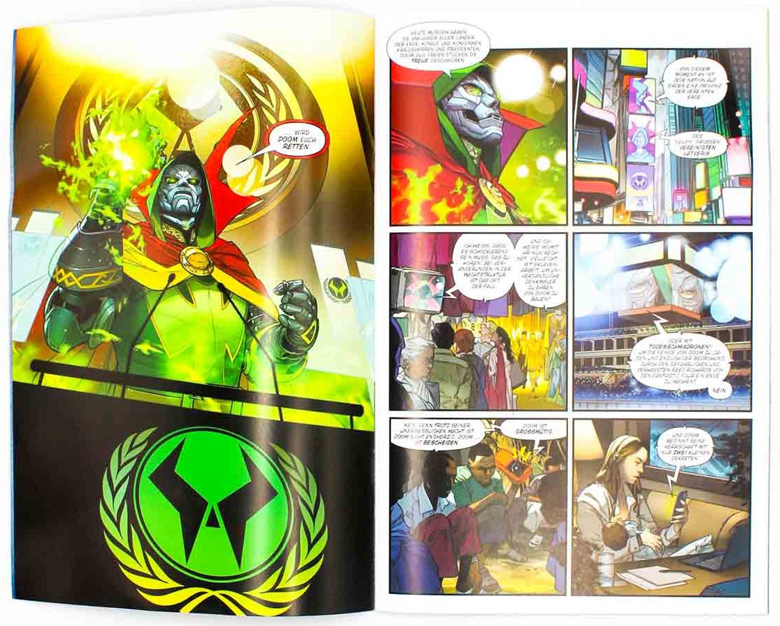 Die ersten 40 Seiten reichen noch nicht aus, um zu beurteilen, ob diese Miniserie nun ein gutes oder ein mittelmäßiges Comicabenteuer werden wird. In absteigender Reihenfolge seien die besten Leistungen von Heft 1 gelobt: Kolorist David Curiel bietet famos abgestimmte, äußerst gelungene und strahlend schöne Farben, die zum immer wieder Zurückblättern und Genießen einladen. Der Brasilianer Rubens Bernardino Da Silva bietet starke Splashpages, dynamische Action und starke Helden, besonders Iron Man sieht toll aus, während Dr. Strange etwas ungewohnt an einen Spanier oder vielleicht Südamerikaner erinnert. Die Story des Kanadiers Ryan North fängt stark an, erfährt mit ihrem Highlight am Ende des Heftes, mit der Wahl von Dooms »Fortbewegungsmittel« aber einen heftigen Drall ins Abgedrehte, man kann auch sagen, ins Lächerliche. Positiv formuliert: Allzu bierernst und politisch brisant scheint dieses Event nicht zu werden, sondern vermutlich eher netter Superhelden-Eskapismus mit mächtiger Bildgewalt. Im Filmbereich wäre das eine Direct-to-DVD-Veröffentlichung.