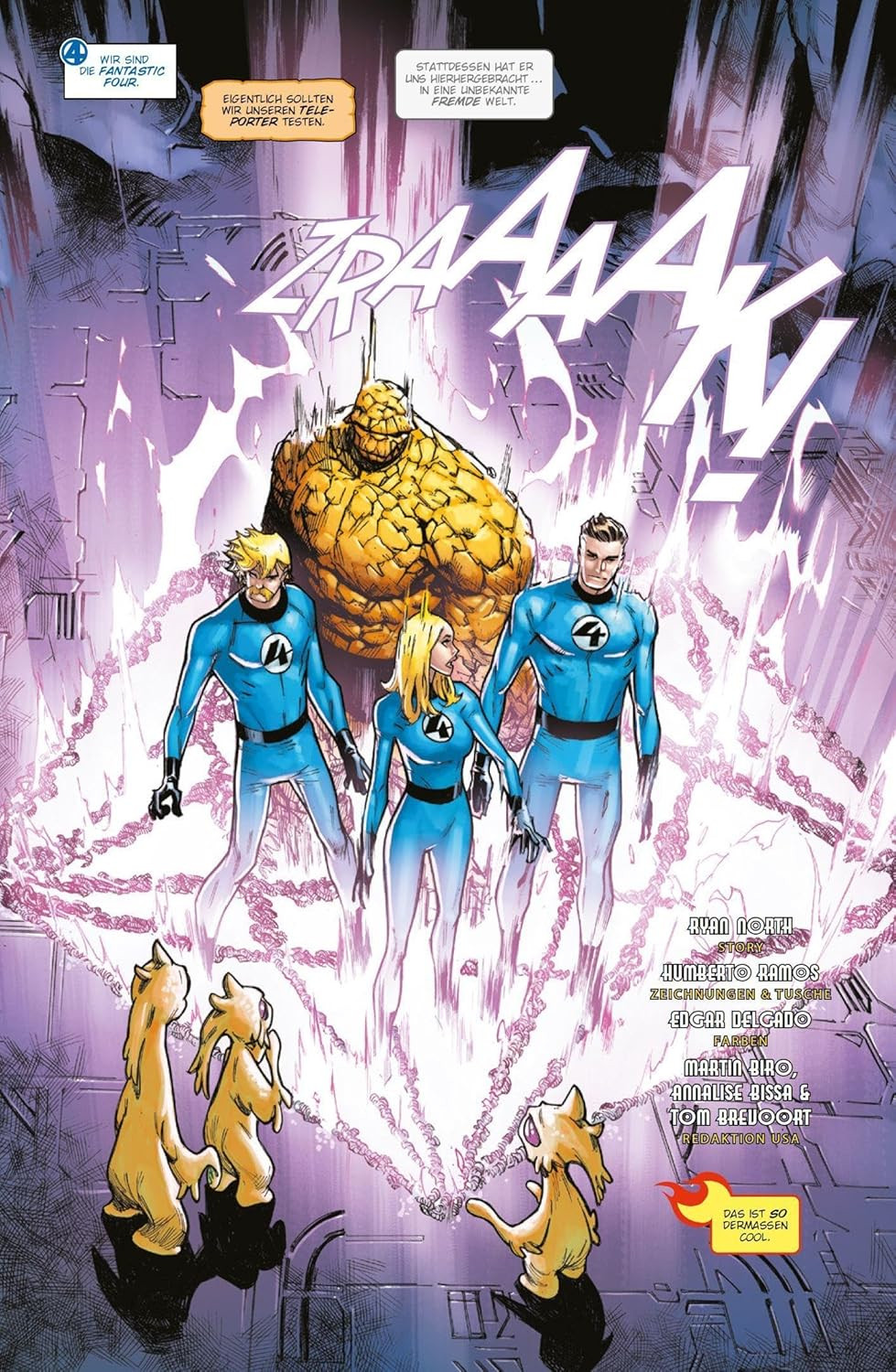 Die Hauptstory ist eine Art Ouvertüre für die neue Serie. Dr. Doom will sich für immer von seinen hartnäckigen Gegenspielern verabschieden und schickt jeden der Vier in eine andere Ära der Erdgeschichte. Die Fackel verschlägt es in die Zeit, bevor es Tiere und Pflanzen gab. Das Ding muss sich mit Dinosauriern herumschlagen, Reed ist im Mittelalter gefangen und Sue in den letzten Tagen des Planeten, lange nachdem die Menschheit ausgestorben ist. Dass ein gutes Familienoberhaupt immer gewissenhaft für seine Sippe vorsorgt, erzählt Ryan North hier wie folgt: Die vier Helden müssen ihre Koordinaten in einen Stein ritzen. Derjenige oder diejenige, die am weitesten in der Zukunft ist, muss die restlichen Personen mit einer Zeitmaschine zurückholen.