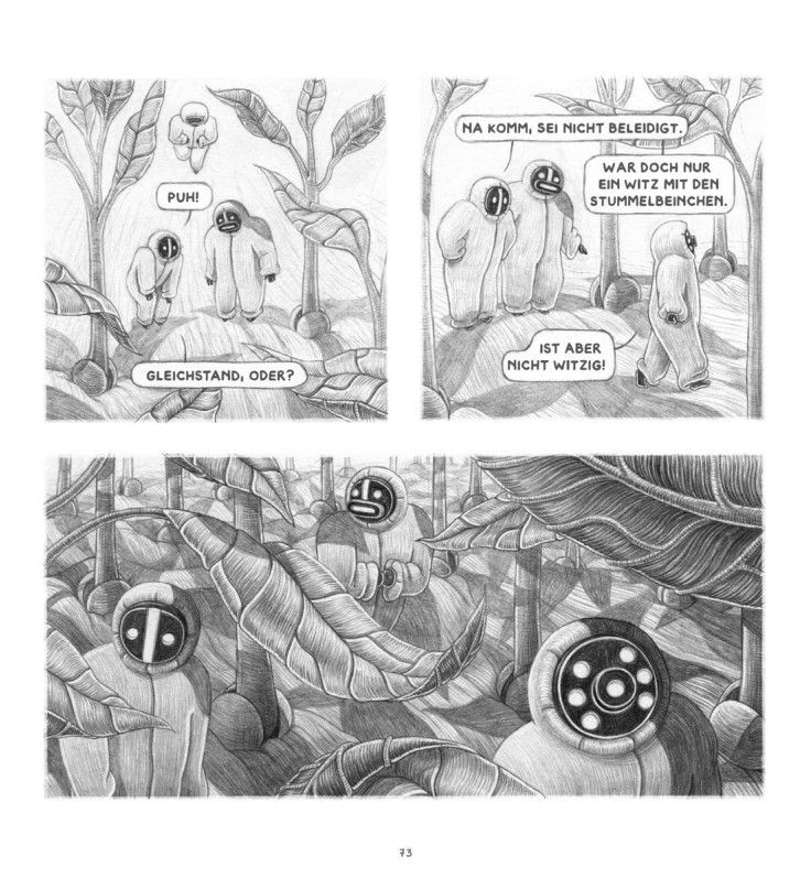 Kranz zeigt ihre erzählerische Stärke auf den ersten Seiten, wenn nicht ein Wort des Dialogs fällt, wenn sie ihren Bleistiftzeichnungen mit ganzseitigen Panels den entsprechenden Raum gibt. Diese Intensität zerfällt im Laufe der Geschichte, wenn Kranz anfängt, in der Erzählung mit Rückblenden zu arbeiten. So wohnen wir der Geschichte von Lan und den Soma zwar bei, aber erleben sie nicht. Die Rituale, die Flucht vor dem Rat, der Alltag in dieser lebensfeindlichen Umgebung, man nimmt es hin, weil es sich wie eine Erzählkonvention anfühlt. Richtig, aber nicht aufregend, nicht nah.