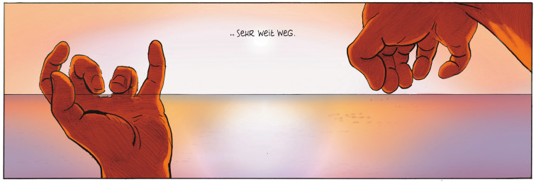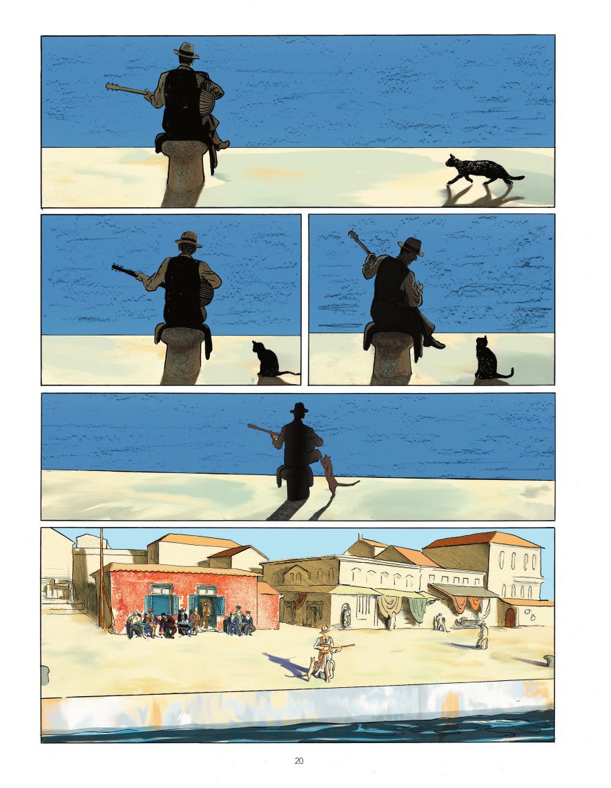 Atmosphäre kann keine Nähe ersetzen. Wenn jemand mit seinem Instrument am Meer sitzt und spielt, passiert einfach mehr, als das Auge sieht. Die Musik verändert die Szene, der künstlerische Ausdruck dieses Menschen fügt dem etwas hinzu. Nur bei Prudhomme nicht. Da sitzt einfach jemand mehrere Panels lang am Meer mit einem Instrument auf dem Schoß, weil der Franzose ihm den Ton abdreht und die Leser nicht heranlässt.