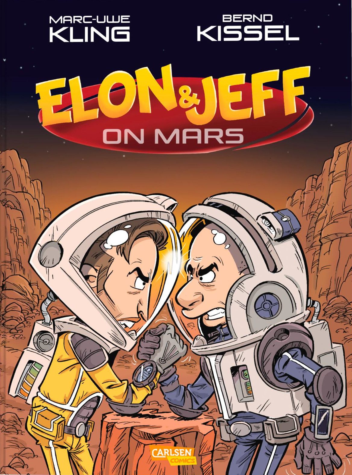 Der Comic erzählt eine 66 Seiten lange Geschichte, die restlichen Seiten sind hübsch gemachtes und informatives Bonusmaterial. Um wen es geht, ist offensichtlich, denn Kling hat die Namen seiner zwei Protagonisten nur minimal verändert. Jeff Jezos will der erste Mann auf dem Mars sein. Zu seiner Enttäuschung hat sein Konkurrent Elon Dusk bereits eine Station auf dem Roten Planeten errichtet. Die beiden Männer verbringen nun, auch mangels Alternativen, sehr viel Zeit miteinander in einer Art Luxus-Wohngemeinschaft. In ihren Gesprächen geht es oft darum, wer von beiden reicher ist und wie das Geld wohl eingesetzt werden kann.