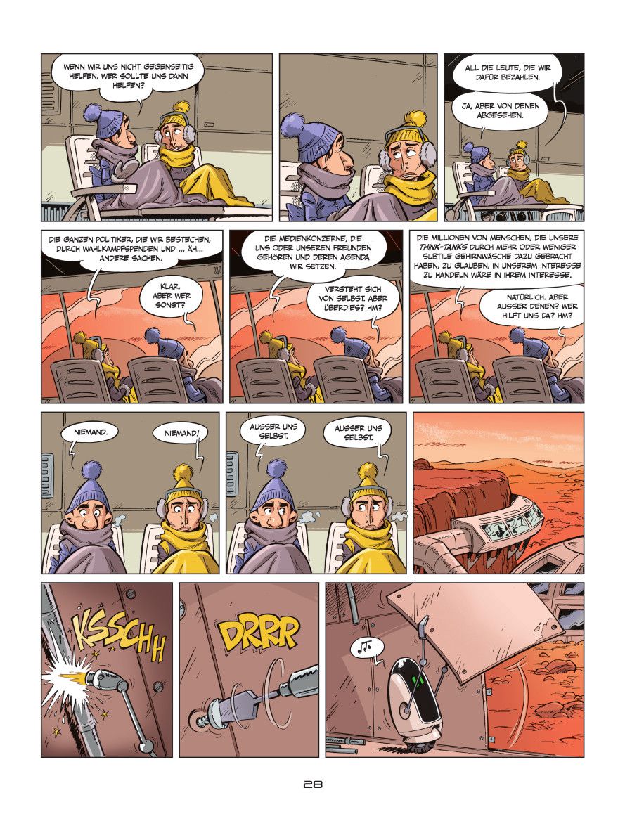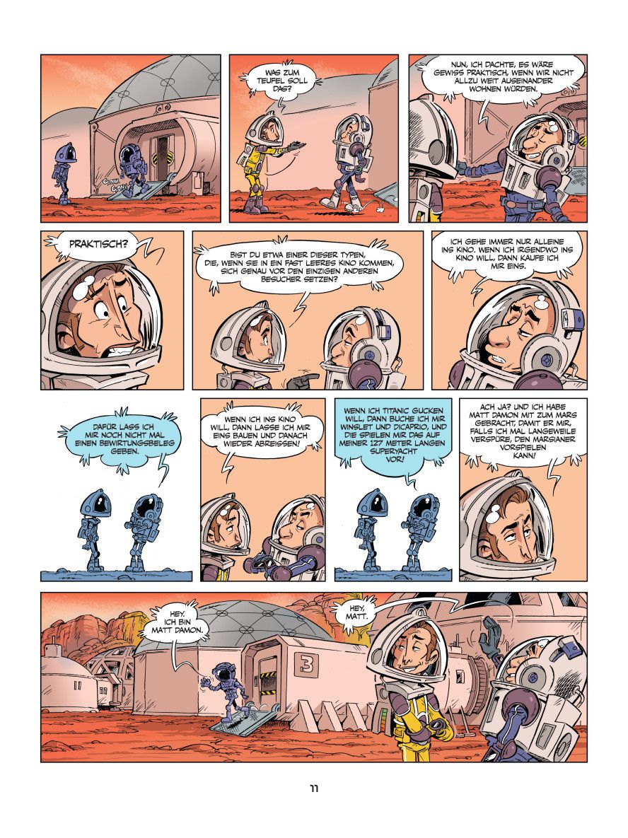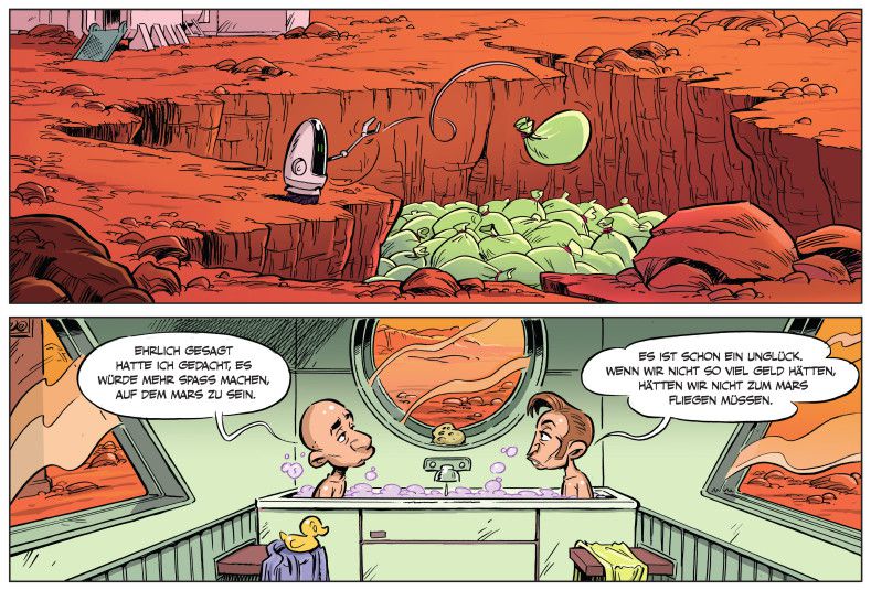 In den schlechtesten Momenten ist dieser Comic dann leider doch in die Kategorie Kabarett aus der Mottenkiste einzuordnen: belehrend, sich lustig machend, aber nie Lösungen, Alternativen oder gar selbstkritische Zwischentöne anstimmend. Es könnte das Publikum ja womöglich überfordern. Schade um die vertane Chance, zeigt uns der Blick in die Welt doch gerade: Humor als Mittel des Widerstands wird dringender gebraucht denn je. Im Zweifelsfall darf's aber lieber der Humor eines Max Goldt, Loriot oder Hauck und Bauer sein als harmlose Kiffer-Witzchen über eine Milliardärs-WG auf dem Roten Planeten.