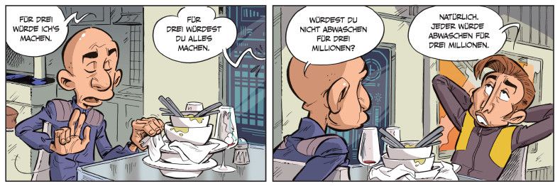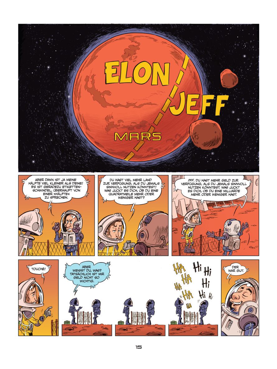 Warum sollte die Menschheit ins All reisen, statt zuerst den eigenen Planeten zu retten? Und würden Menschen dort nicht dieselben Fehler erneut begehen? Im Comic scheint es so, hier wird sehr sorglos alles vollgemüllt. Zu den Sticheleien von Jeff und Elon gehört es, sich aus unangenehmen Aufgaben wie dem Abwasch freizukaufen. Ob Kling Jeff Bezos die Arbeit übernehmen lässt, weil dieser bei Amazon als besonders sparsam galt, bleibt unklar. Im Mittelpunkt stehen oberflächliche Beobachtungen und Gags zum Kiffen und anderem Drogenkonsum Musks. Zu aktuell, politisch oder bissig wird der Ton des Comics nie. Jeff knuddelt gerne mit seinem Teddybären und Musks Flirts mit dem Faschismus werden lediglich am Rande gestreift. Es bleibt der Eindruck, dass ganz viele Möglichkeiten für kluge Beobachtungen und lustige Witze liegen gelassen wurden.