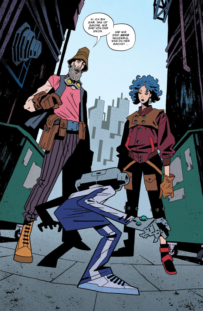 Interessant und wohl kein Zufall: Die Erfinder von Time Before Time stammen aus der »alten« Welt. Die Szenaristen Declan Shalvey und Rory McConville kommen aus Irland. Zeichner Joe Palmer lebt und arbeitet in London. Einem breiteren Publikum dürfte aus diesem Trio zumindest Declan Shalvey ein Begriff sein. Er ist auch Zeichner und stieg 2006 ins Comicgeschäft ein. Ende 2010 arbeitete er erstmals für Marvel und gestaltete u.a. die Serien Thunderbolts (2010–2012), Winter Soldier (2013) und Moon Knight (2014). Inzwischen ist er auch als Autor unterwegs und verfasste 2018 Deadpool Vs Old Man Logan. Zeichner Joe Palmer hat einen Stil, der an die Ligne claire angelehnt ist und ein wenig an Mike Mignolas Hellboy erinnert. Passend dazu koloriert der ebenfalls aus Irland stammende Chris O'Halloran in einfarbigen Flächen. Und in erstaunlich dunklen Tönen. Vermutlich um zu unterstreichen, dass die Story alles andere als lustig ist. Im dritten Band kümmern sich übrigens Ron Salas und Eric Zawadzki um die Grafik und schließen sehr gut an Palmers vorangegangene Arbeit an.