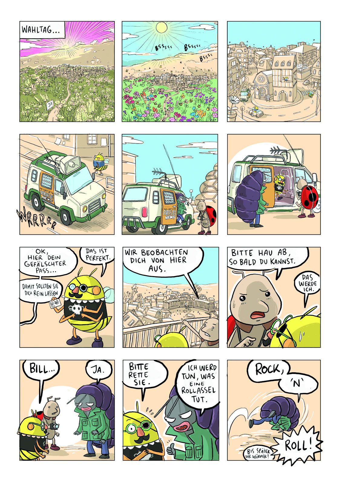 Damit hat die von Gott und der Fischer besungene Maja nichts zu tun. Wohl aber Ladybug – Die Stadt der Bienen von Frederico Cacciapaglia. Auch wenn sich der bekennende Antisemit Bonsels des Ausdrucks Faschismus zum Zeitpunkt der Entstehung von Die Biene Maja wohl noch nicht bewusst war, ist retrospektiv klar, dass seine Geschichte dem sich anbahnenden faschistischen Zeitgeist entsprach. Cacciapaglia wählt in seiner Fabel diese Metapher aber bewusst – und in seiner vollen Negativität. So begleiten wir die leicht naive Journalistin Ladybug, deren Ressort Pflanzen und Essen ist, und ihren Fotografen, die Rollassel Bill Bug, zu ihrem ersten großen Artikel. Sie sollen über die anstehende Wahl in der Bienenstadt berichten. Gleich zu Beginn wundern sie sich darüber, warum überhaupt eine Wahl abgehalten wird, da es ja eh nur eine Bienenkönigin gibt. Es wird klar, dass Bienenstadt eine geschlossene Gesellschaft ist. Die Bienen mögen keine anderen Insekten. An der streng bewachten Grenze wird deutlich, dass es aber sogar dabei Abstufungen gibt. Flügellose Insekten gelten als noch niedere Wesen als Insekten mit Flügeln. Deshalb wird der Fotograf Bill Bug direkt verhaftet und abgeführt.