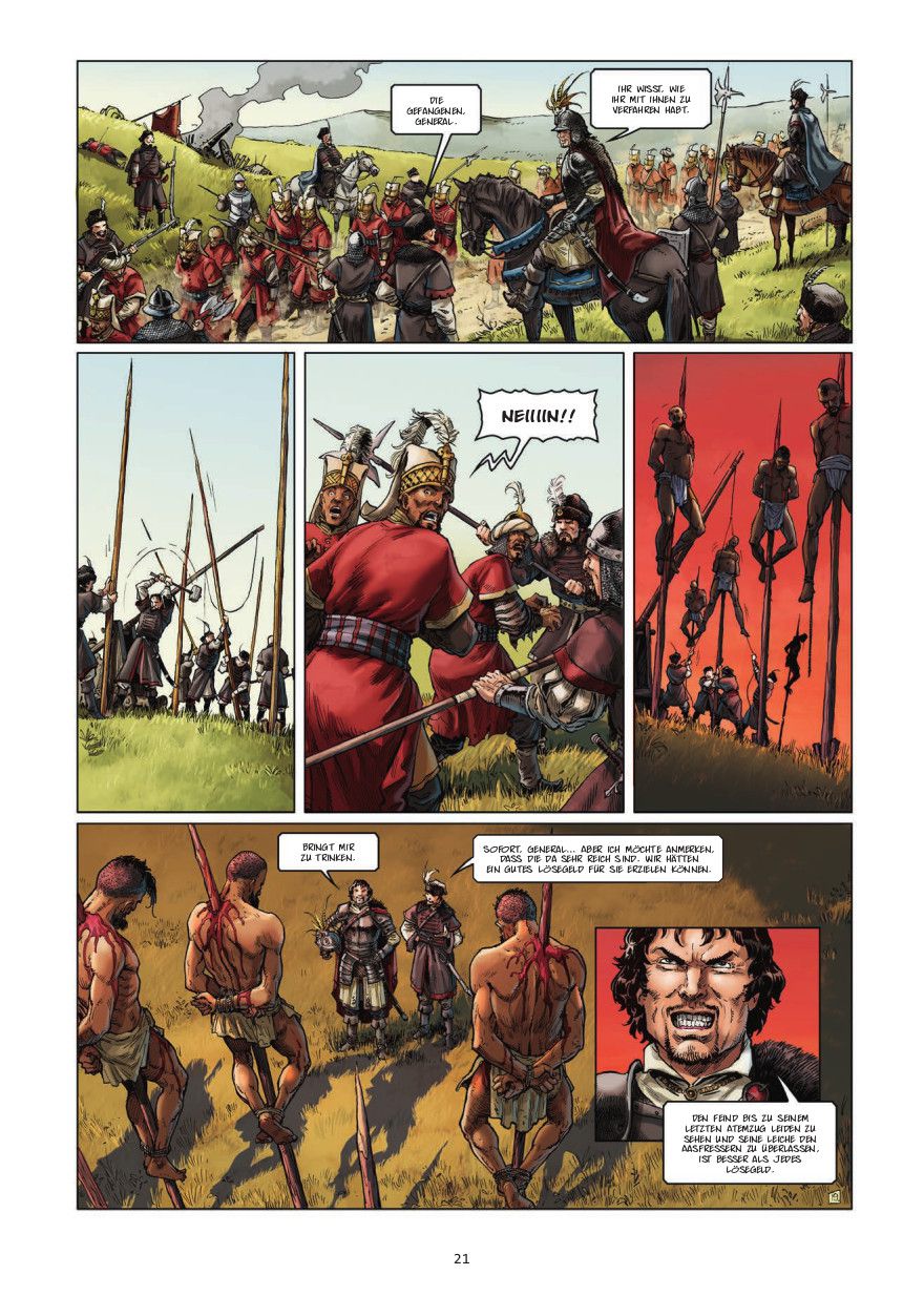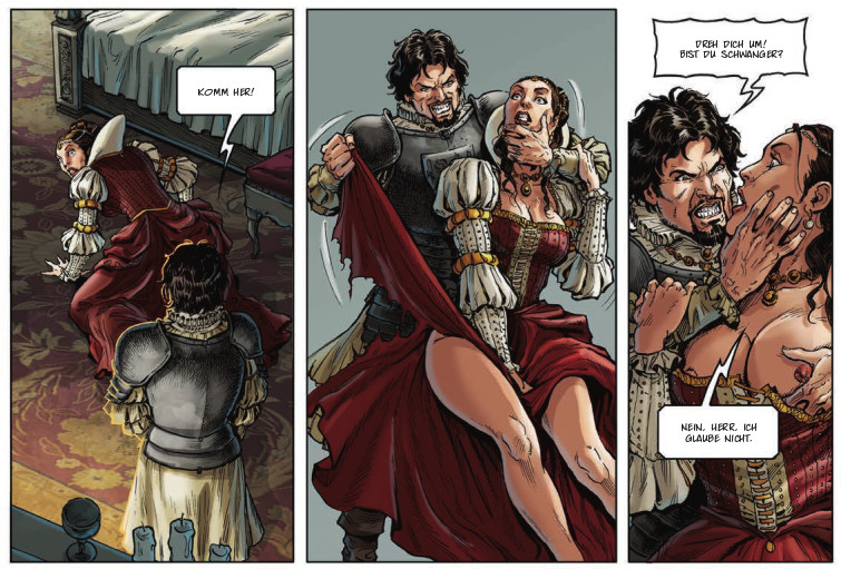 Natürlich greift sie in Pécaus Szenario auch nur so zum Spaß einfach mal zum Messer. So muss beispielsweise ihr junger, hübscher, unschuldiger Diener, den sie zwischendurch vernascht hat, in allerbester Sharon-Stone-Manier à la Basic Instinct (1992) das Zeitliche segnen. Geschenkt und unnötig. Zwei Seiten mit unnützem Zeug verschwendet, die gut zur historischen Einordnung gebraucht worden wären. Stattdessen zeigt der Comic in epischer Breite und mit vielen nackten Hinterteilen die Verbrechen der Gräfin und ihre Besessenheit von ewiger Jugend, die sie durch das Baden im Blut junger Frauen zu erreichen versucht haben soll.