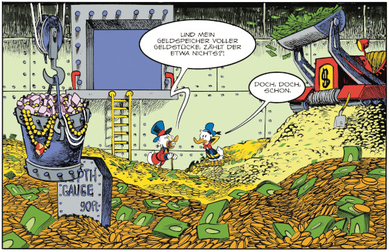 Es gibt Momente im Leben, in denen man sich ganz schön alt fühlt. Der eigene moralische Kompass scheint aus der Mode gekommen zu sein. Alle anderen wirken klüger als man selbst und werden in Rekordzeit mit Methoden reich, von denen man noch nie etwas gehört hat. So ergeht es Onkel Dagobert im jüngsten Disney-Hommage-Band. Darin verliert Dagobert den Titel als »reichste Ente der Welt« an Kersten Duck, der sein Vermögen mit der Kryptowährung Bitquack angehäuft hat.