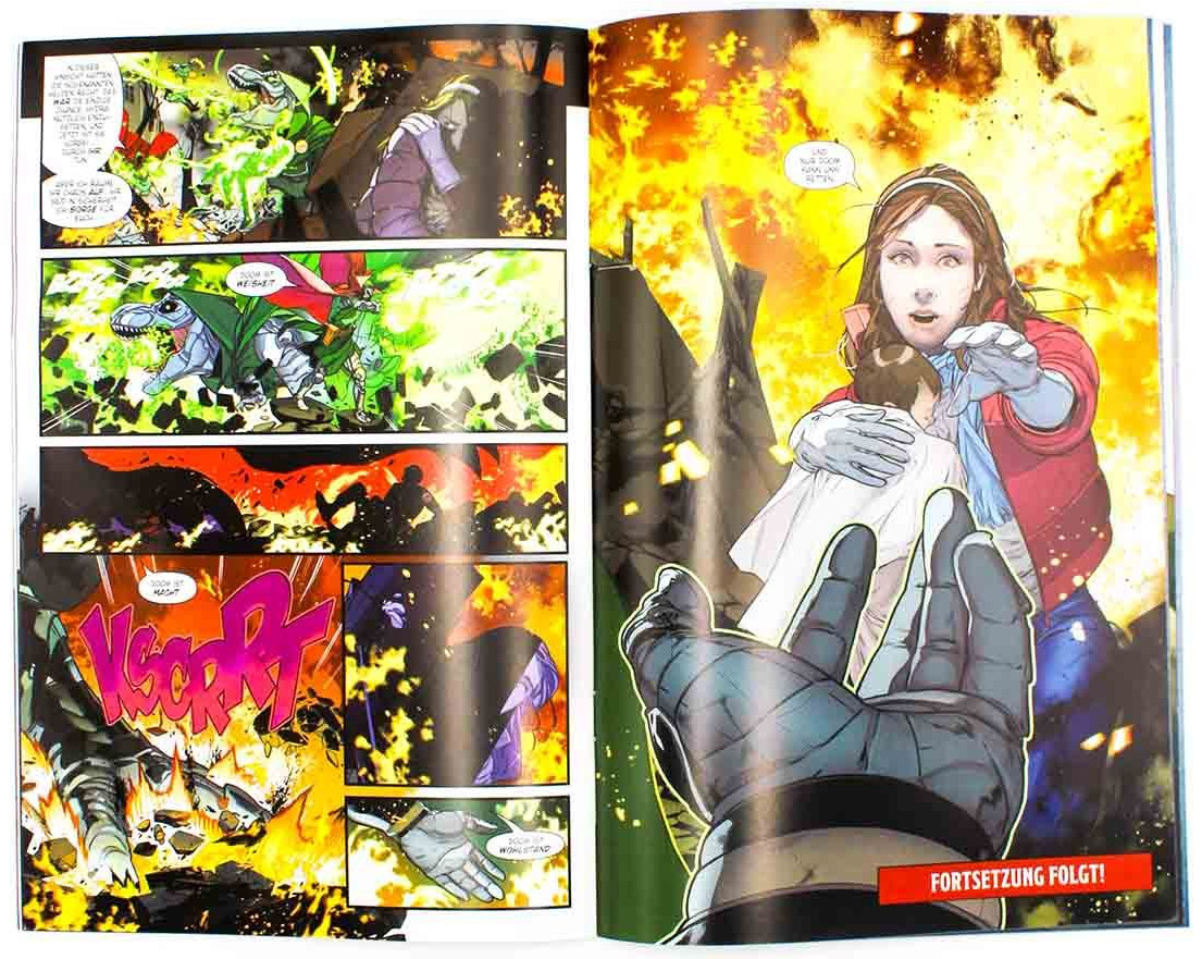 Die ersten 40 Seiten reichen noch nicht aus, um zu beurteilen, ob diese Miniserie nun ein gutes oder ein mittelmäßiges Comicabenteuer werden wird. In absteigender Reihenfolge seien die besten Leistungen von Heft 1 gelobt: Kolorist David Curiel bietet famos abgestimmte, äußerst gelungene und strahlend schöne Farben, die zum immer wieder Zurückblättern und Genießen einladen. Der Brasilianer Rubens Bernardino Da Silva bietet starke Splashpages, dynamische Action und starke Helden, besonders Iron Man sieht toll aus, während Dr. Strange etwas ungewohnt an einen Spanier oder vielleicht Südamerikaner erinnert. Die Story des Kanadiers Ryan North fängt stark an, erfährt mit ihrem Highlight am Ende des Heftes, mit der Wahl von Dooms »Fortbewegungsmittel« aber einen heftigen Drall ins Abgedrehte, man kann auch sagen, ins Lächerliche. Positiv formuliert: Allzu bierernst und politisch brisant scheint dieses Event nicht zu werden, sondern vermutlich eher netter Superhelden-Eskapismus mit mächtiger Bildgewalt. Im Filmbereich wäre das eine Direct-to-DVD-Veröffentlichung.