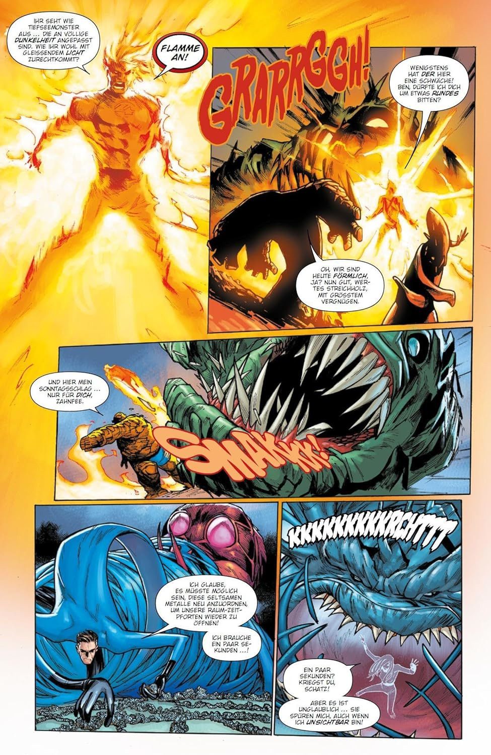 Die Hauptstory ist eine Art Ouvertüre für die neue Serie. Dr. Doom will sich für immer von seinen hartnäckigen Gegenspielern verabschieden und schickt jeden der Vier in eine andere Ära der Erdgeschichte. Die Fackel verschlägt es in die Zeit, bevor es Tiere und Pflanzen gab. Das Ding muss sich mit Dinosauriern herumschlagen, Reed ist im Mittelalter gefangen und Sue in den letzten Tagen des Planeten, lange nachdem die Menschheit ausgestorben ist. Dass ein gutes Familienoberhaupt immer gewissenhaft für seine Sippe vorsorgt, erzählt Ryan North hier wie folgt: Die vier Helden müssen ihre Koordinaten in einen Stein ritzen. Derjenige oder diejenige, die am weitesten in der Zukunft ist, muss die restlichen Personen mit einer Zeitmaschine zurückholen.