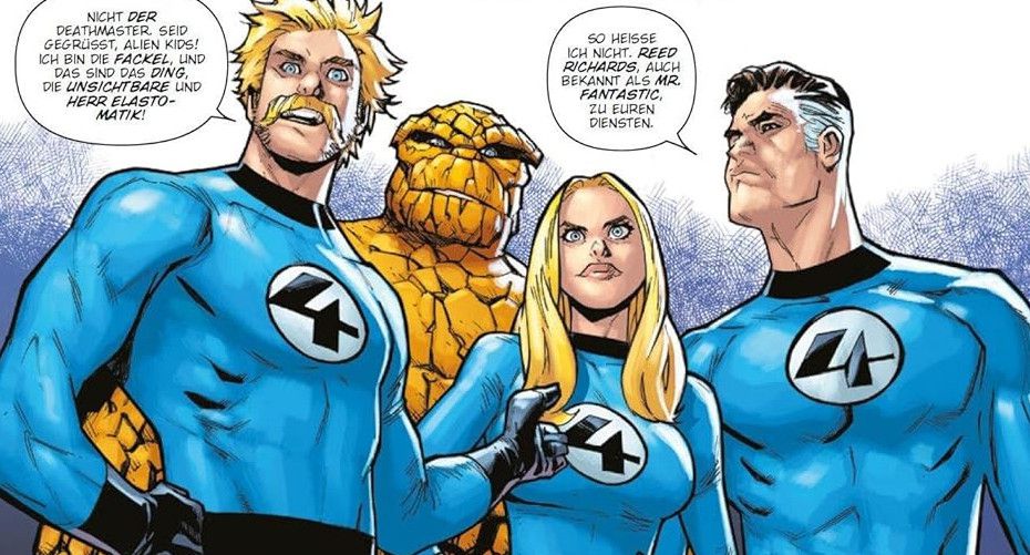 Eingebunden in die Rahmenhandlung des Events One World Under Doom wurde in den USA im vergangenen Jahr eine neue Comicreihe der Fantastic Four gestartet. Jetzt erscheint sie auch in Deutschland. Panini bringt im ersten Sammelband ein Abenteuer der Fantastischen Vier vom Free Comic Book Day vom Juni 2025 und die ersten drei US-Hefte der neuen Reihe in der deutschen Übersetzung von Bernd Kronsbein. Schön ist dieser Comic geworden, zuerst einmal zeichnerisch. Die Bilder von Humberto Ramos sind dynamisch, detailliert und werden durch die Kolorierung von Edgar Delgado zu einer visuellen Pracht. Das Vorgeplänkel vom Gratis-Comic-Tag ist eher nett als notwendig. Die F4 landen auf einer intergalaktischen Teenager-Party, bei der die Kids eine Art Geisterbeschwörung durchgeführt hatten, weil ihnen gerade langweilig war. Nun müssen Reed Richards, Sue Storm, Ben Grimm und der mit seinem Schnurrbart doch sehr an Ivo Robotnik aus den Sonic-Videospielen erinnernde Johnny Storm ihren Weg zurück auf die Erde finden – wie gesagt: Für lau ist diese Episode okay.