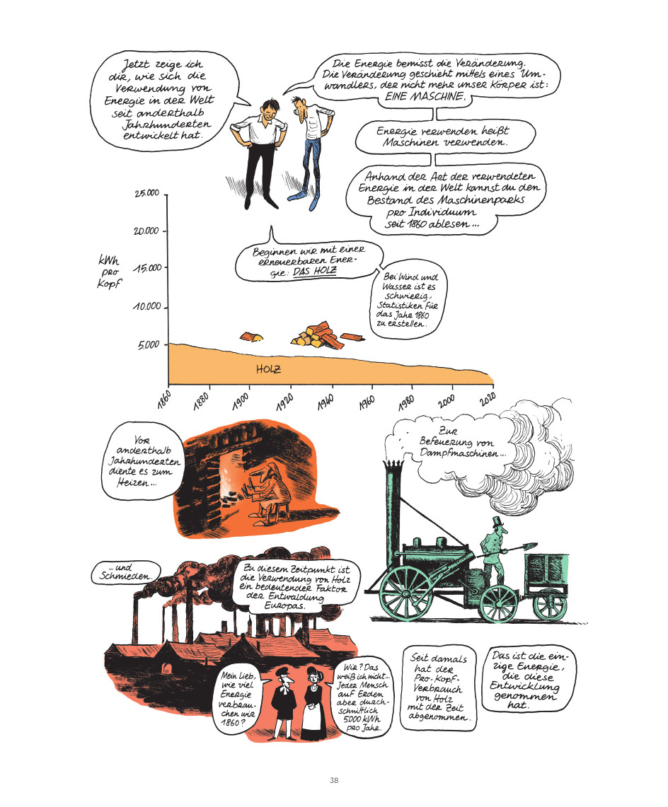 Im Prolog erinnert sich Christophe Blain an den Sommer 2018, als die Presse zum ersten Mal eine Hitzewelle in Frankreich mit dem Klimawandel in Verbindung brachte und er anfing, sich Sorgen zu machen. Er erinnert sich, wie ihm sein Bruder kurz darauf zu diesem Thema Vorträge von Jean-Marc Jancovici empfahl; offenbar nicht zum ersten Mal. Und er das dann genervt beiseiteschob, um im Jahr darauf erneut mit seinem Bruder darüber zu sprechen. Der dann dabei einen Schritt weitergeht und schnörkellos rät: »Mach ein Buch mit Jean-Marc Jancovici«. Jancovici ist Experte für Energie- und Klimafragen, Mitbegründer eines auf Klimafragen spezialisierten Beratungsunternehmens, Präsident des Thinktanks The Shift Project und Hauptentwickler der wichtigsten französischen Methode zur Kohlenstoffbilanzierung.