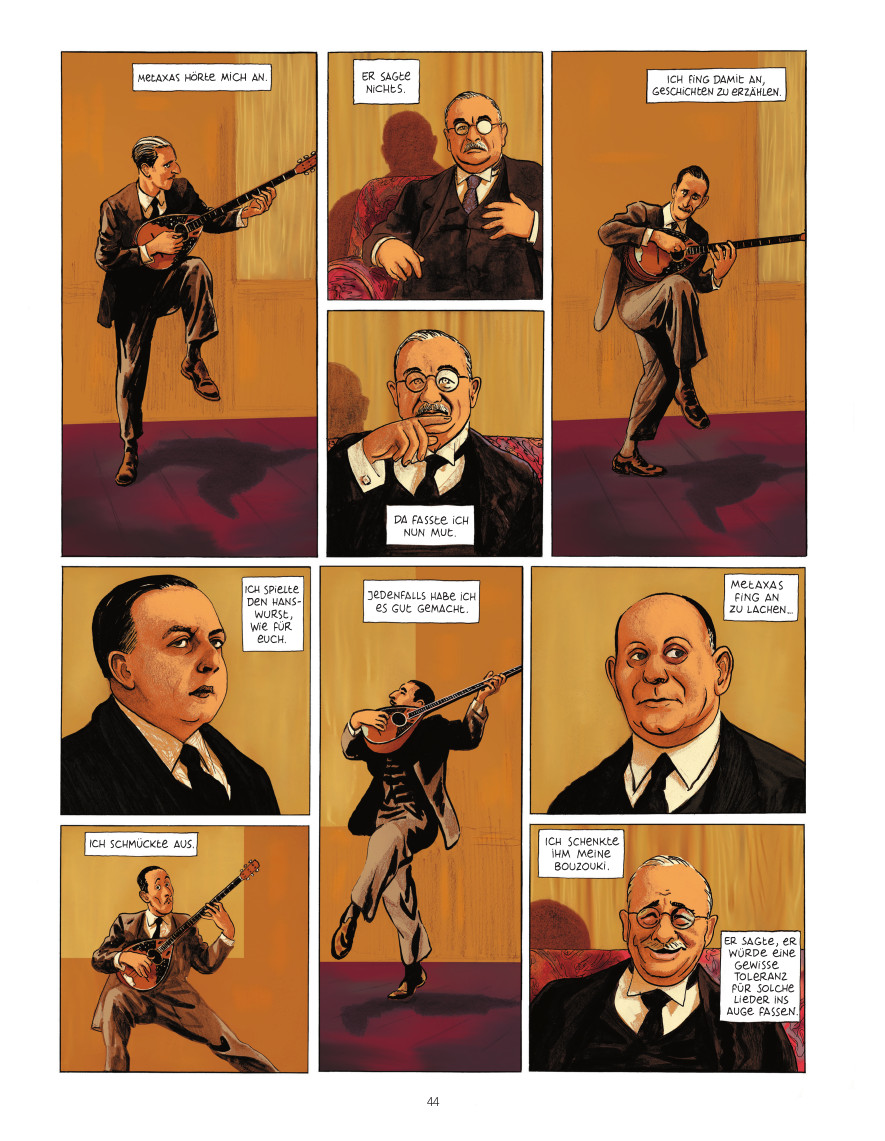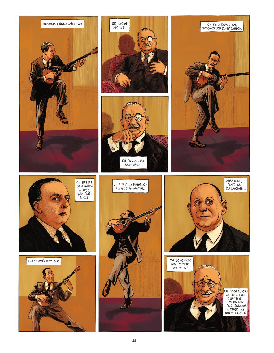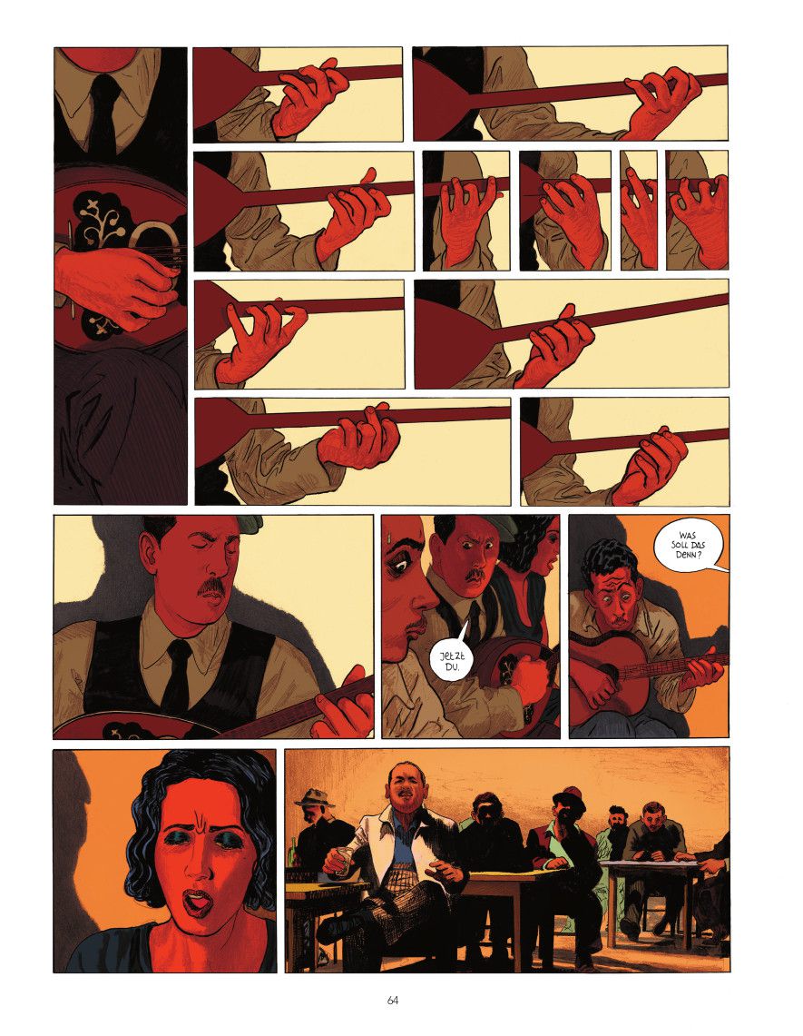 Der französische Zeichner berichtet von den Schicksalen mehrerer Menschen in Piräus. Es geht um Beba, die für sich und ihre Kunst kämpfen will, um ihre Halbschwester Marika, die von einer großen Sängerinnenkarriere träumt, um Katina, die Wirtin eines Rembetiko-Cafés – und noch eine ganze Reihe anderer Personen. Was auf der knappen Seitenzahl viel anreißt, aber wenig zu Ende bringt. Prudhomme arbeitet stark mit Farben und Atmosphäre: Die drückende Hitze, die Angst vor der Diktatur, all dies lässt sich in dieser Graphic Novel fühlen. Ja, Stimmung gibt es reichlich.