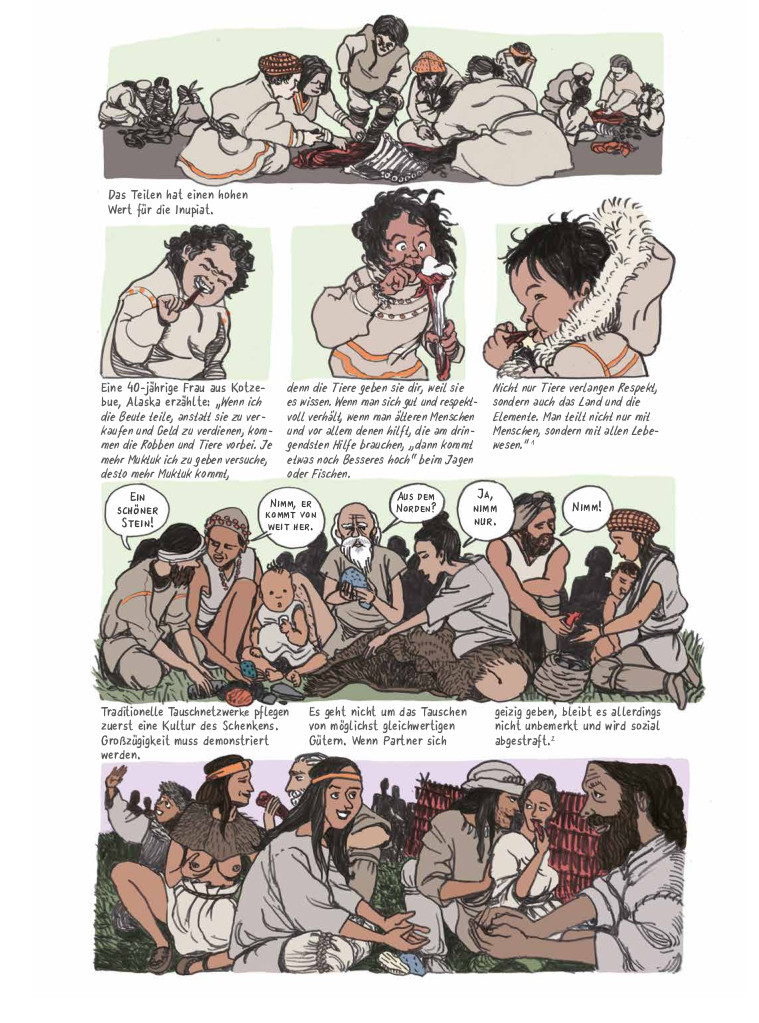 Gut möglich, dass Ulli Lust das damalige Leben idealisiert, doch was sie erzählt, basiert auf aktuellen Forschungsergebnissen, die dem alten Bild der Frühzeit massiv widersprechen. Damit schließt sie an den ersten Band der Reihe an, der die Rolle der Frau in dieser Zeit thematisierte. Auch in dem Band, der im vergangenen Jahr als erstes Comic überhaupt zum Sachbuch des Jahres gekürt wurde, verbindet Lust Erkenntnisse aus der aktuellen Forschung zu einem Bild, das diametral zu alten Dogmen steht. Das ist mehr als eine Korrektur von Irrtümern – lange wurde mit den vermeintlich objektiven Erkenntnissen die »natürliche« Rollenverteilung von Mann und Frau begründet. Heute wissen wir: Die männlich geprägte Wissenschaft reproduzierte vor allem ihr eigenes patriarchales Weltbild.