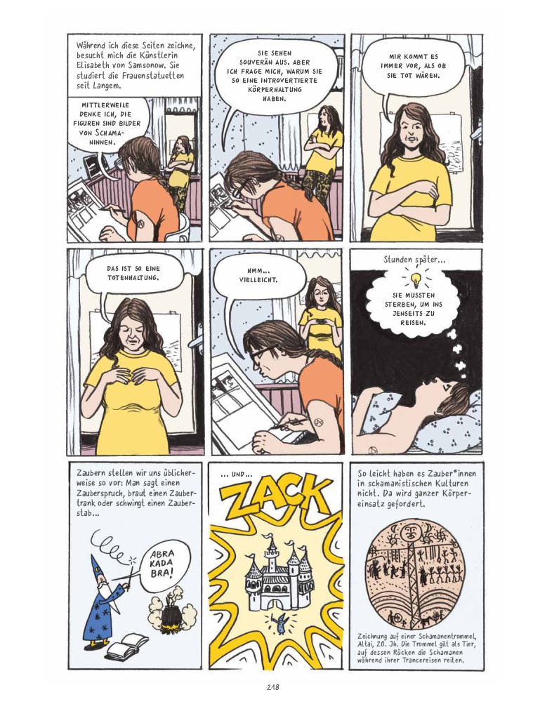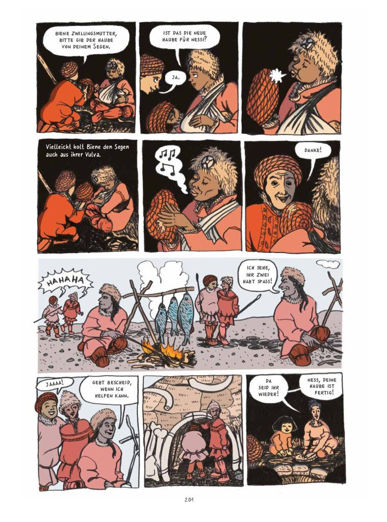 Natürlich geht es auch wieder um Frauen, diesmal, wie der Titel schon sagt, besonders um ihre Rolle als Schamaninnen. Das Wort lässt an Geisterbeschwörung oder Traumdeutung denken, aber damals war die Schamanin auch Ärztin, Hebamme, Ernährungsberaterin und Coach. Im Gegensatz zum ersten Band, in dem, wie im Sachcomic meist üblich, viel Wissen abstrakt vermittelt wird, gibt es diesmal mehrere feste Charaktere, über die der aktuelle Wissensstand lebensnah erzählt. Zu ihnen gehört die Schamanin Füchsin, die sich nicht wesentlich von den vielen Frauen unterscheidet, die noch heute alles können und alles tun, tagaus und tagein, lächelnd und gerne. Vielleicht ist das die Natur des Menschen?