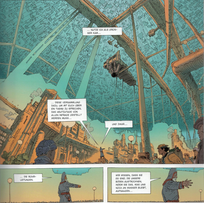 Perriots Zeichnungen sind spektakulär, seine Welt ist vielfältig. Trotz aller Reminiszenzen, ob an Mœbius, Wells oder an Actionsequenzen aus Filmen wie Krieg der Sterne (1977) ...: