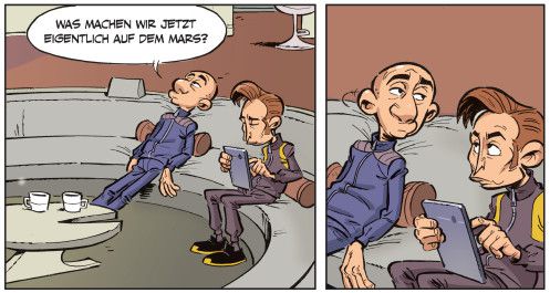 In den schlechtesten Momenten ist dieser Comic dann leider doch in die Kategorie Kabarett aus der Mottenkiste einzuordnen: belehrend, sich lustig machend, aber nie Lösungen, Alternativen oder gar selbstkritische Zwischentöne anstimmend. Es könnte das Publikum ja womöglich überfordern. Schade um die vertane Chance, zeigt uns der Blick in die Welt doch gerade: Humor als Mittel des Widerstands wird dringender gebraucht denn je. Im Zweifelsfall darf's aber lieber der Humor eines Max Goldt, Loriot oder Hauck und Bauer sein als harmlose Kiffer-Witzchen über eine Milliardärs-WG auf dem Roten Planeten.