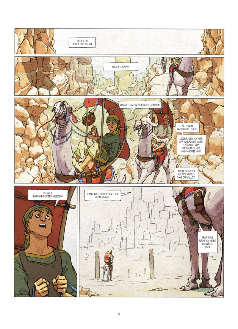Nun also ein neuer Comic im selben Format und mit einer ähnlichen Geschichte. Statt mit Bällen wird diesmal mit Fäusten und Füßen ausgeteilt. Es geht um den Kampfsport Pankat, der dem Comic seinen Namen gibt. Wer ihn beherrscht, dem Winken Ruhm und Ehre. Der junge Mané ist eigens dafür durch die Wüste gereist, um in einer fernen, mittelalterlich-arabisch anmutenden Stadt zum Pankat-Meister aufzusteigen. Das Ende seiner strapaziösen Reise sieht atemberaubend aus: