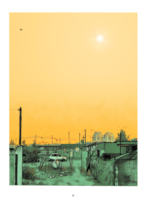 Ebenso konsequent ist die grafische Umsetzung: Die Figuren eiern auf ihren sinnlosen Wegen durch elende Gassen, flankiert von maroden Flachbauten, und schmale Straßen, die null zu den Protzautos der Mafia passen, von den Ansprüchen der großen Herren ganz zu schweigen – sie sind eben bloß Könige des Drecks. Zudem ist das ganze Buch in fiesen Gelb-, Grün- und Grautönen gehalten, was das Elend bestens verstärkt. Alles ist so überrissen hoffnungslos, so völlig grotesk, dass ich die ganze Zeit vor mich hin grinsen musste.