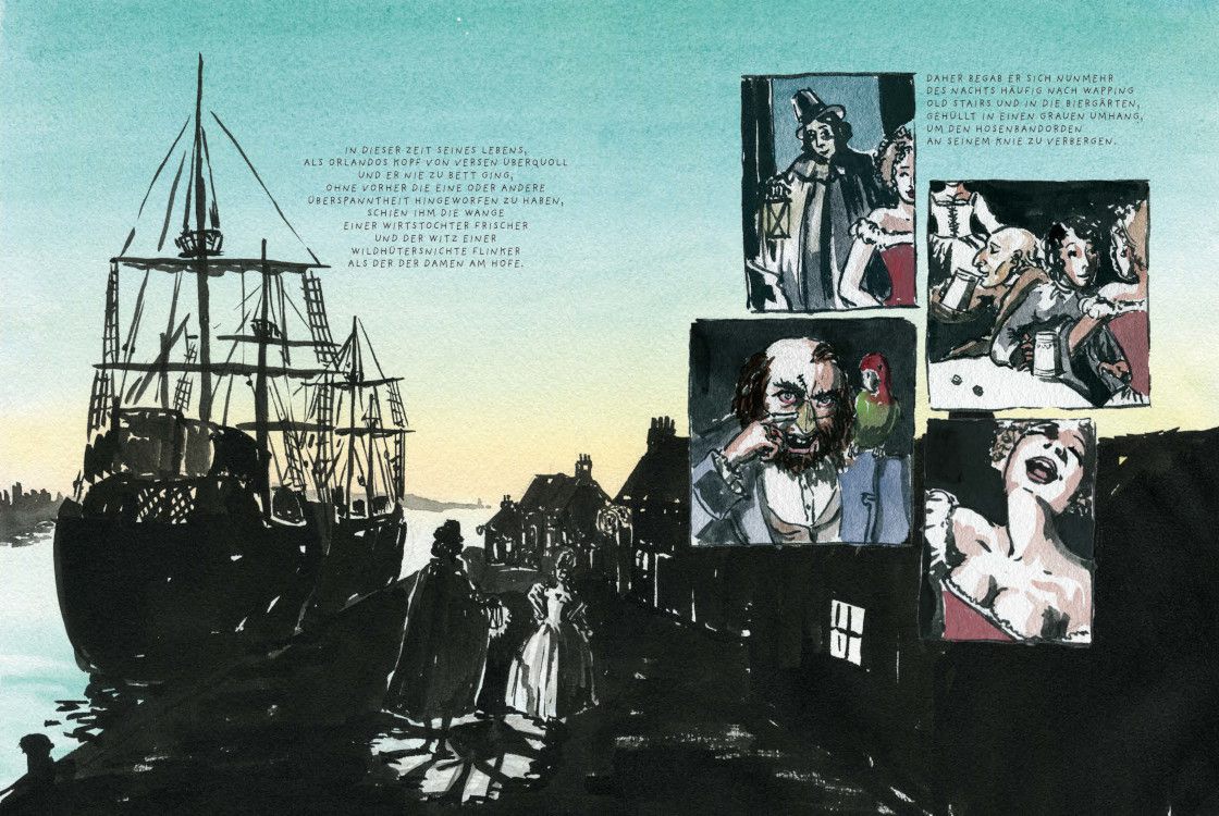 Kuhlendahl hat bereits einige Erfahrung sammeln können mit Comicadaptionen von Literaturklassikern. Unter anderem erschien 2019 Der Tod in Venedig nach der Novelle von Thomas Mann. Mit Virginia Woolf selbst hat sich Kuhlendahl in ihrer gleichnamigen, inzwischen vergriffenen, 2021 erschienenen Biografie befasst; sie ist also eine Kennerin der Autorin. Sie arbeitet in Orlando stilistisch gleich wie in ihrer Woolf-Biografie. Ihre Aquarellzeichnungen passen sich der jeweiligen Epoche an. Geschickt unterteilt Kuhlendahl den Roman in Kapitel, die den Jahrhunderten entsprechen, die Orlando durchlebt, orientiert an den Herrscher:innen, denen er bzw. sie unterworfen war. Und auch die Darstellung und Farbgebung entspricht den gesellschaftlichen Gegebenheiten der Zeit. So stellt Kuhlendahl z.B. die beengenden moralischen Vorstellungen und die langsam einsetzende Industrialisierung der viktorianischen Zeit durch das Wegnehmen von Farbe und die Dominanz von Grautönen dar, die nur durch die Flucht ins private Glück, Orlandos Heirat, wieder bunt wird.