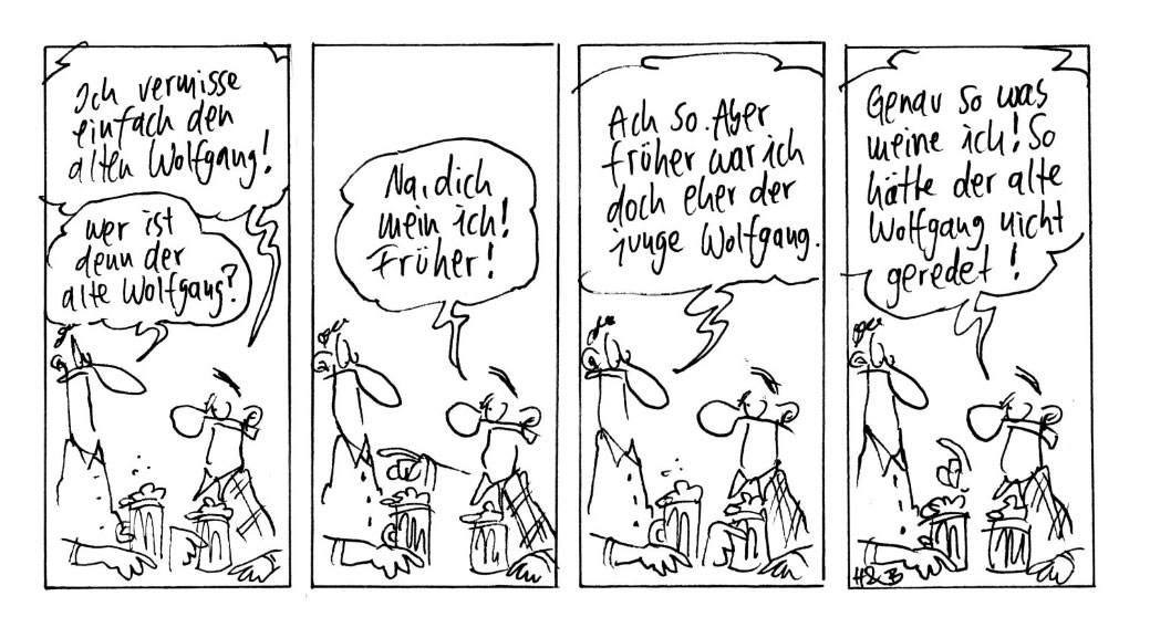 B: Unser Comic ist ja untypisch, weil es keine wiederkehrenden Figuren gibt. Da fängt es ja immer wieder bei Null an. Eigentlich ist es auch ein bisschen ein Cartoon in vier Bildern. (Überlegt.) Aber was wollte ich sagen?