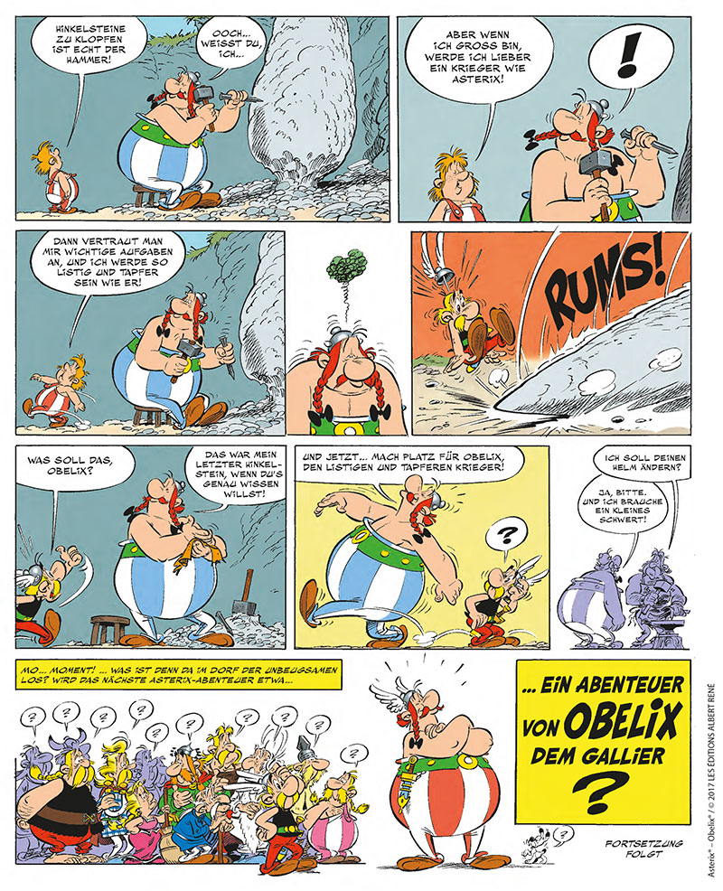 Wir nehmen all dies zum Anlass, 2017 zum »Asterix-Jahr« werden zu lassen und haben unser Programm entsprechend ausgerichtet. Der klare – konkurrenzlose – Höhepunkt wird natürlich »Asterix in Italien«. Es wird nicht nur eine Soft- und Hardcoverausgabe geben, sondern auch eine limitierte Luxusausgabe sowie voraussichtlich wieder eine Superluxusausgabe mit signierten Drucken. Den Autorenjubiläen und der so besonderen Partnerschaft Goscinnys und Uderzos begegnen wir mit zwei Publikationen: Zum einem veröffentlichen wir das letzte gemeinsame Werk der beiden, »Asterix bei den Belgiern«, im Juli als einmalige Sonderausgabe mit 16 Zusatzseiten und außerdem zum ersten Mal ein frühes Werk der beiden, die Gesamtausgabe von Benjamin und Benjamine. Und dann gibt es neben Mundartbänden auch noch ein großes Buch mit allen Lateinzitaten aus Asterix.